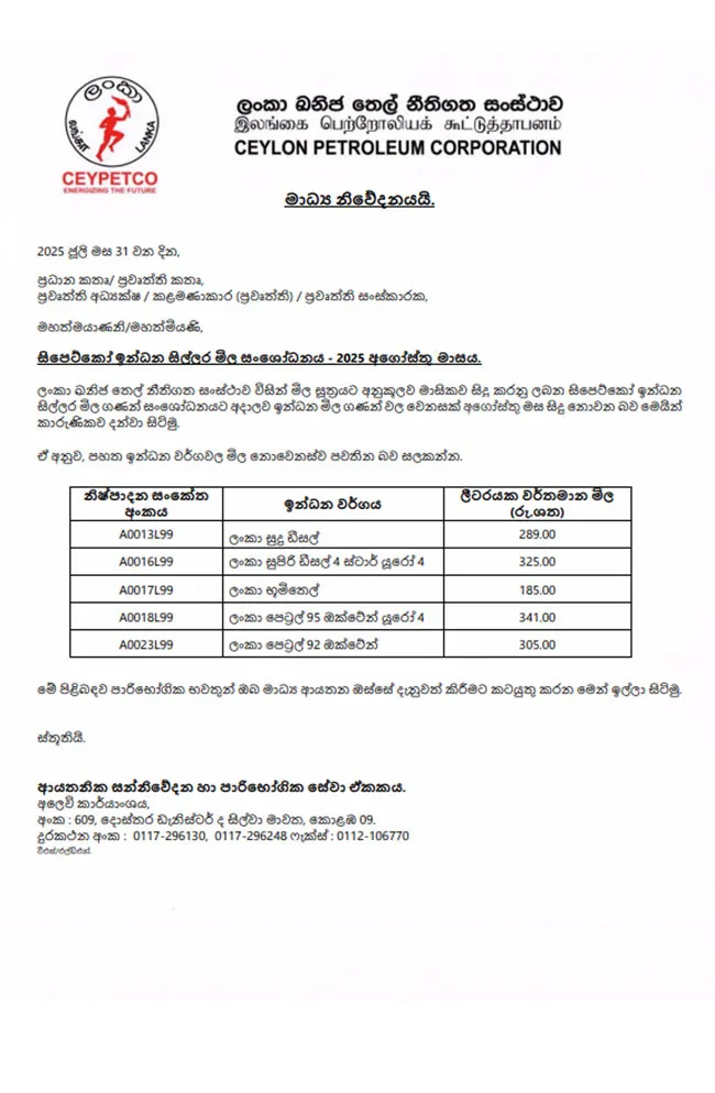 ලංකා ඛනිජ තෙල් නීතිගත සංස්ථාවේ මිල සූත්‍රයට අනුකූලව මාසිකව සිදු කරනු ලබන සිපෙට්කෝ ඉන්ධන සිල්ලර මිල ගණන් සංශෝධනයට අදාලව, අගෝස්තු මස ඉන්ධන මිල ගණන්වල වෙනසක් සිදු නොවන බව එම සංස්ථාව නිවේදනය කරයි.ඒ අනුව පසුගිය වර ජූලි මාසයට අදාලව සිදුවූ ඉන්ධන මිල සංශෝධනයම අගෝස්තු මාසයටත් බල පැවැත්වෙනු ඇති.