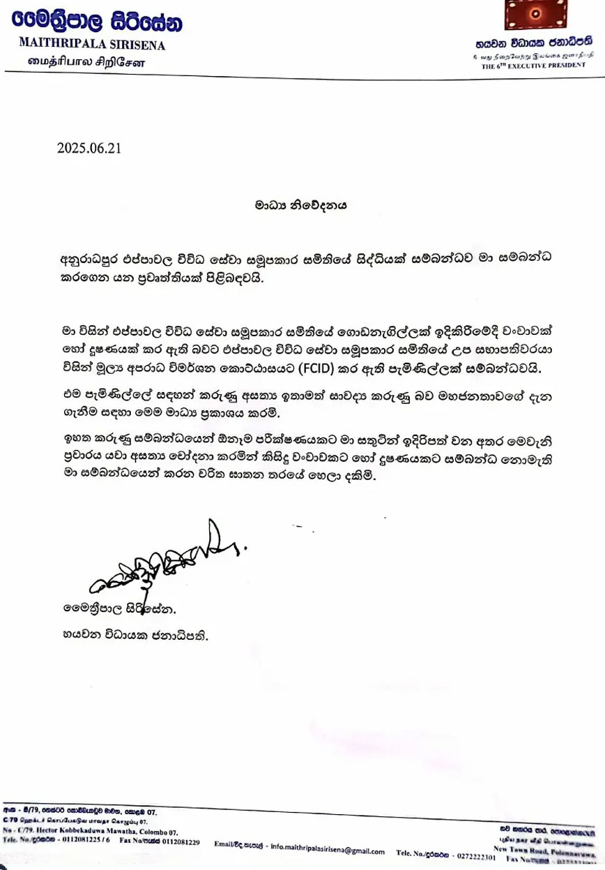 එප්පාවල විවිධ සේවා සමූපකාර සමිතියේ සිද්ධියක් සම්බන්ධව තමා සම්බන්ධ කරගෙන පළවන පුවත් සම්බන්ධව හිටපු ජනාධිපති මෛත්රීපාල සිරිසේන අද (21) නිවේදනයක් නිකුත් කර තිබෙනවා.