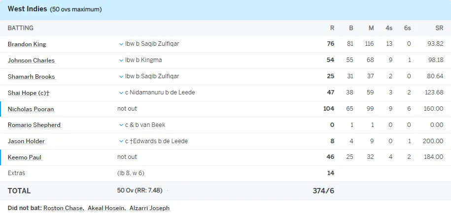 Brandon King පන්දු 81කදී ලකුණු 76ක් රැස්කරගැනීමට සමත්වු අතර අගනා ඉනිමක් ක්රීඩා කළ Nicholas Pooran හයේ පහර 6ක් සහ හතරේ පහර 9ක් සමග පන්දු 65කදී ලකුණු 104ක් රැස්කළා.Johnson Charles ලකුණු 54ක් රැස්කළ අතර වේගවත් ඉනිමක් ක්රීඩා කළ Keemo Paul පන්දු 25කදී ලකුණු 46ක් රැස්කළේය.