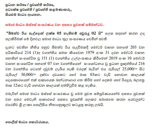 මෙම නීතිය සම්බන්ධයෙන් සමාජ මධ්යයේ සංසරණය වන ඇතැම් අසත්ය පුවත් පිළිබඳව නිවේදනයක් නිකුත් කරමින් පොලිස් මාධ්ය කොට්ඨාසය මේ බව සඳහන් කළා.