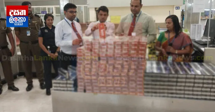 රුපියල් එක් කෝටි පහළොස් ලක්ෂ පනස් දහසක් වටිනා විදේශීය නිෂ්පාදිත දුම්වැටි තොගයක් නීතිවිරෝධී ලෙස මෙරටට රැගෙන ආ ගුවන් මගීන් දෙදෙනෙකු , කටුනායක ගුවන් තොටුපොළ “හරිත මාවත” (Green Channel ) ඔස්සේ පිට වී යාමට තැත් කරමින් සිටියදී කටුනායක ගුවන් තොටුපොළ රේගු නිලධාරීන් විසින් අද (23) අලුයම අත්අඩංගුවට ගනු ලැබුවා.
