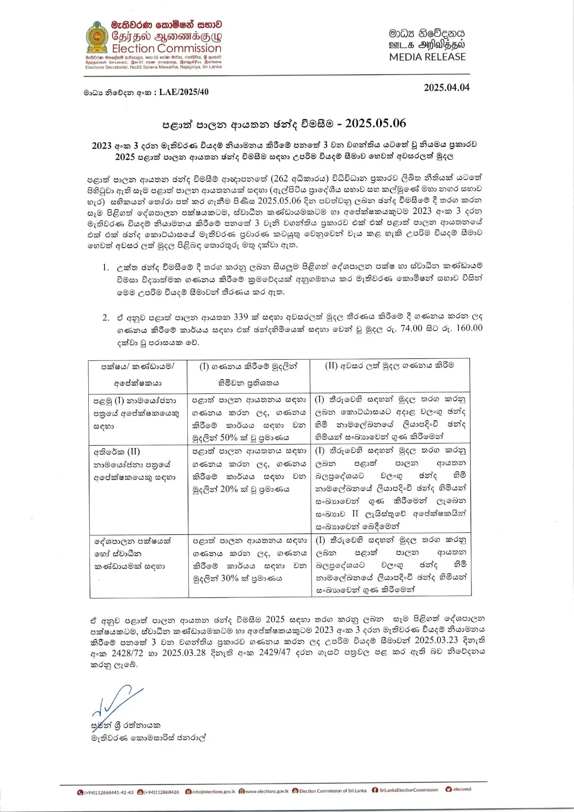 ඒ, අනුව පළාත් පාලන ආයතන 339ක් සඳහා අවසර ලත් මුදල තීරණය කිරීමේ දී ගණනය කරන ලද ගණනය කිරීම් කාර්යය සඳහා එක් එක් ඡන්ද හිමියෙක් සදහා වෙනු වූ මුදල රුපියල් 74 සිට 160ක් දක්වා පරාසයක පවතින බවයි එම කොමිෂන් සභාව දැනුම් දෙන්නේ.