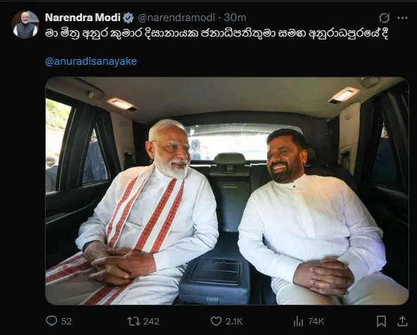 මේ අතර මෝදි අගමැතිවරයා සහ ජනාධිපති අනුර කුමාර අනුරාධපුරයට පැමිණෙන අතර තුර, නරේන්ද්ර මෝදි සිය එක්ස් ගිණුමට විශේෂ ඡායාරුපයක් එක්කර තිබුණා.