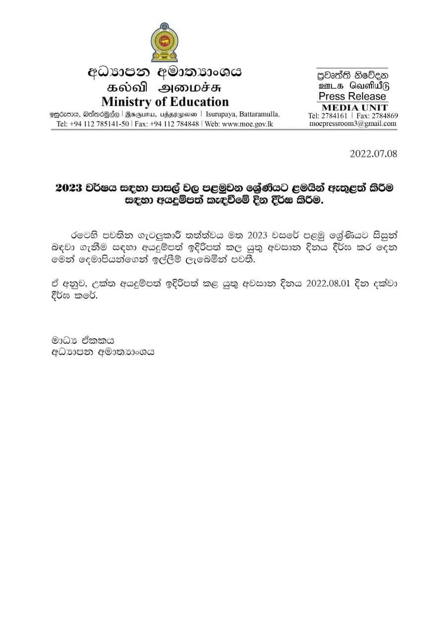 පළමු ශ්‍රේණියට ළමුන් ඇතුළත් කිරීම ගැන දැනුම්දීමක්